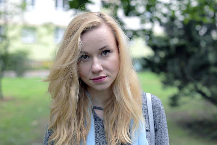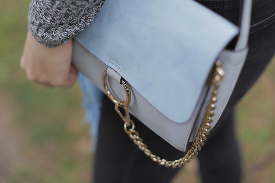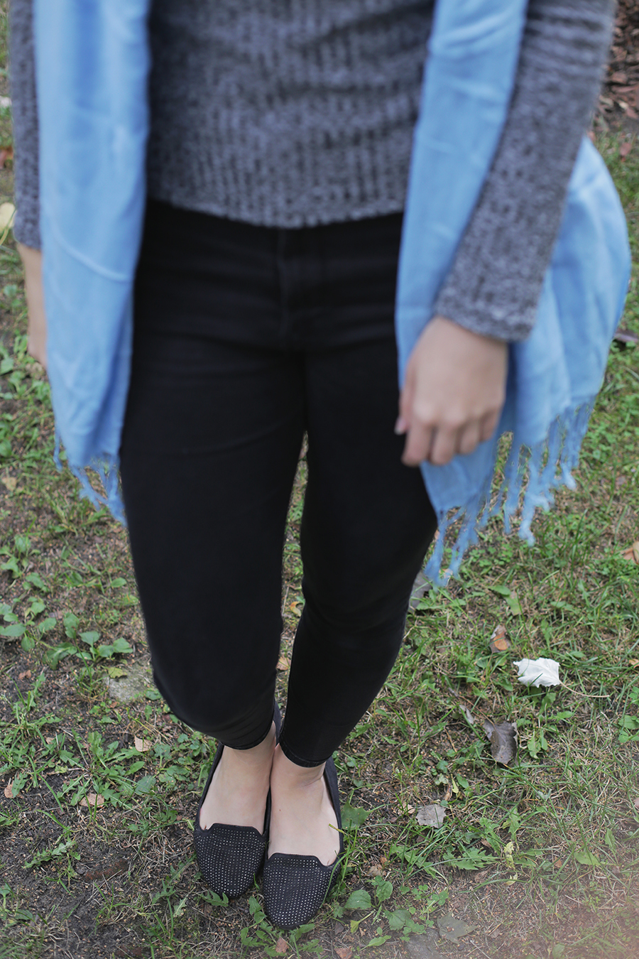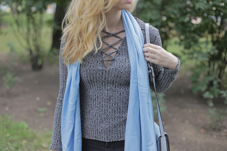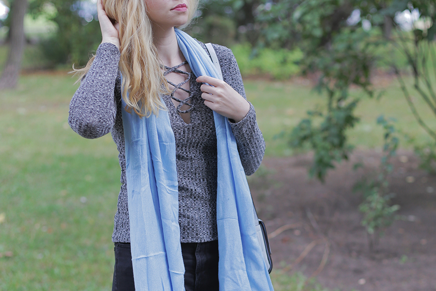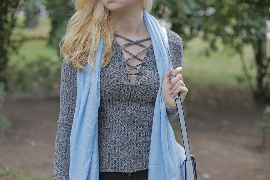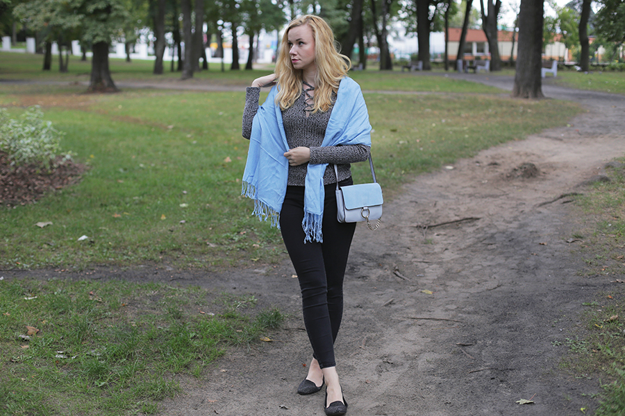 Dzisiejsza stylizacja, którą chcę się z wami podzielić, to codzienny look na spacer w ciepły, jesienny dzień. Gdy w mojej szafie pojawiają się nowości, mam zawsze milion pomysłów z czym je skomponować i nie mogę się oprzeć, aby je od razu założyć. Tak było też tym razem. Postawiłam więc na czerń i szarość przełamane lekkim błękitem szalika oraz torebki, w której jestem totalnie zakochana. Co o tym sądzicie ?