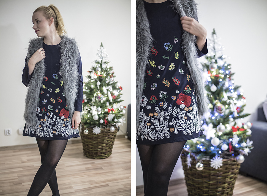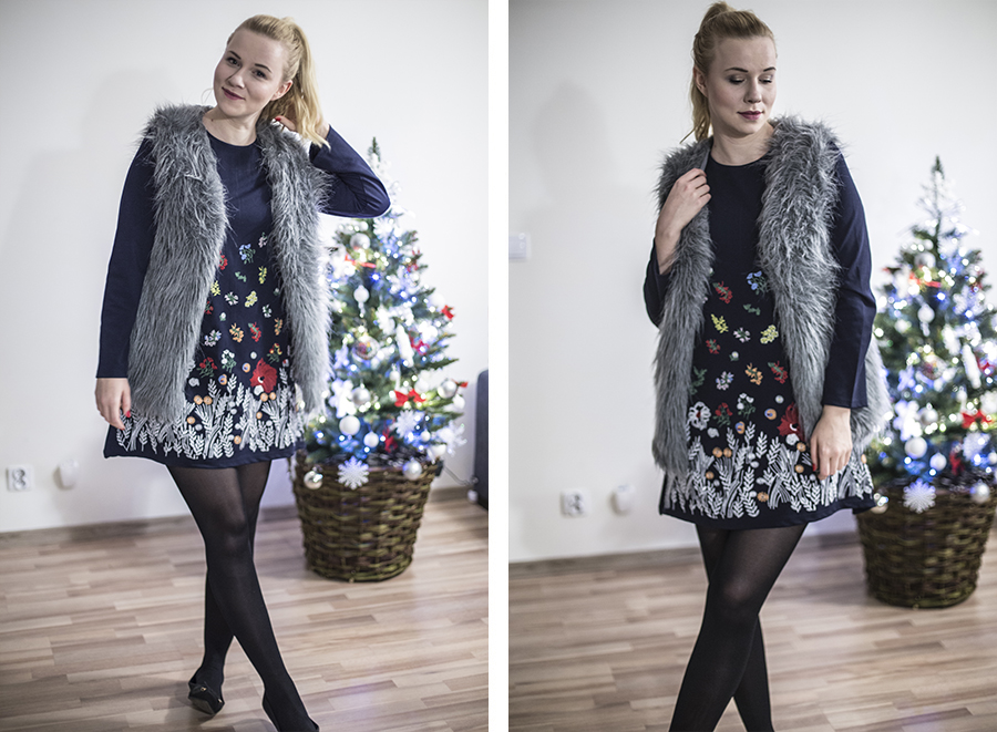 Kwiatowe wzory mogą kojarzyć się głównie z wiosną czy latem, jednak nic bardziej mylnego, świetnie sprawdzają się także w chłodniejsze dni. Z tego powodu dziś postawiłam na granatową sukienkę w haftowane kwiaty, które są jednym z wiodących trendów obecnego sezonu. Chcąc nadać bardziej zimowego charakteru całej stylizacji, dorzuciłam szarą kamizelkę, która jest jednym z moich ulubieńców w sezonie grzewczym, wszystko dlatego, że jestem okropnym zmarźluchem.
