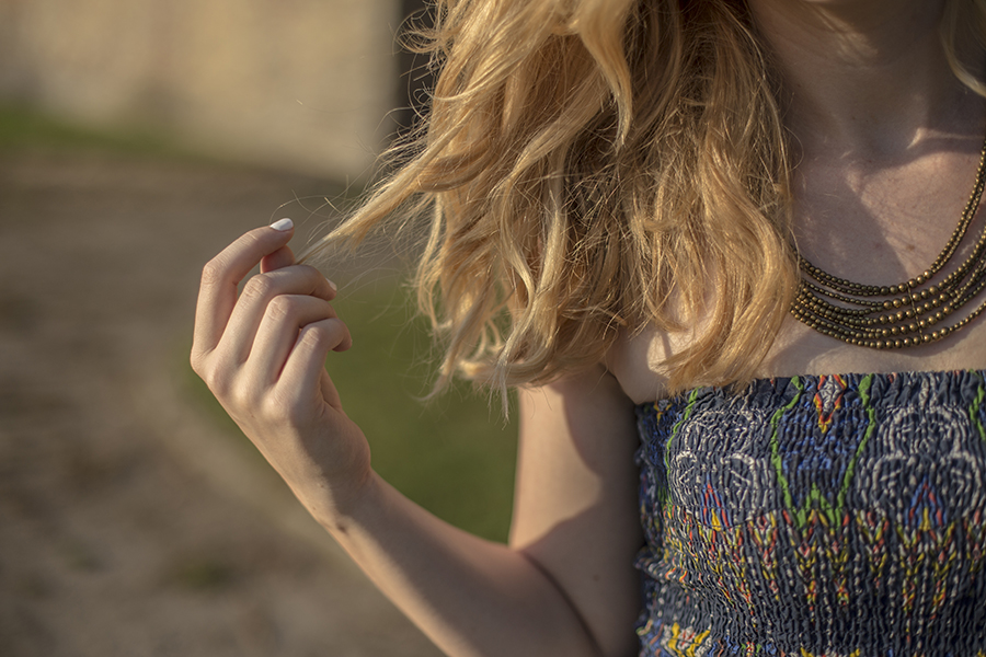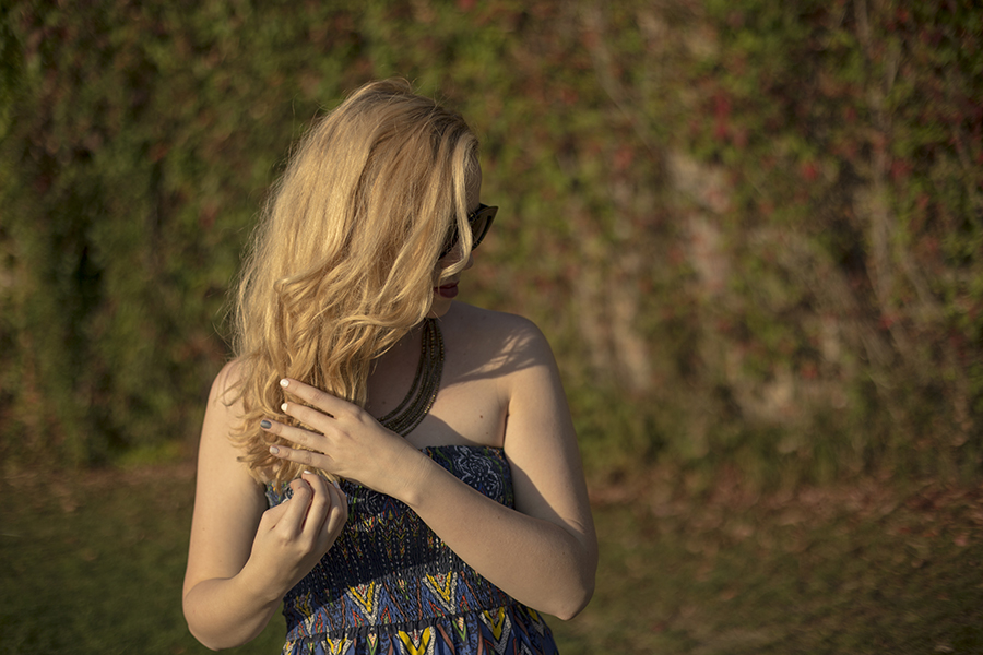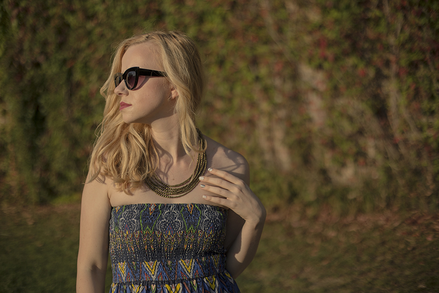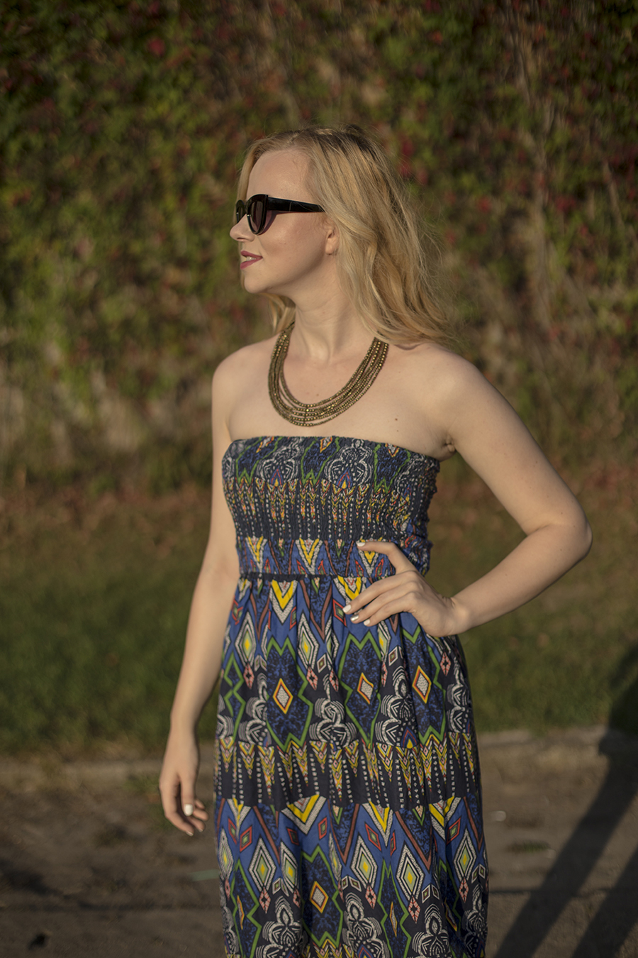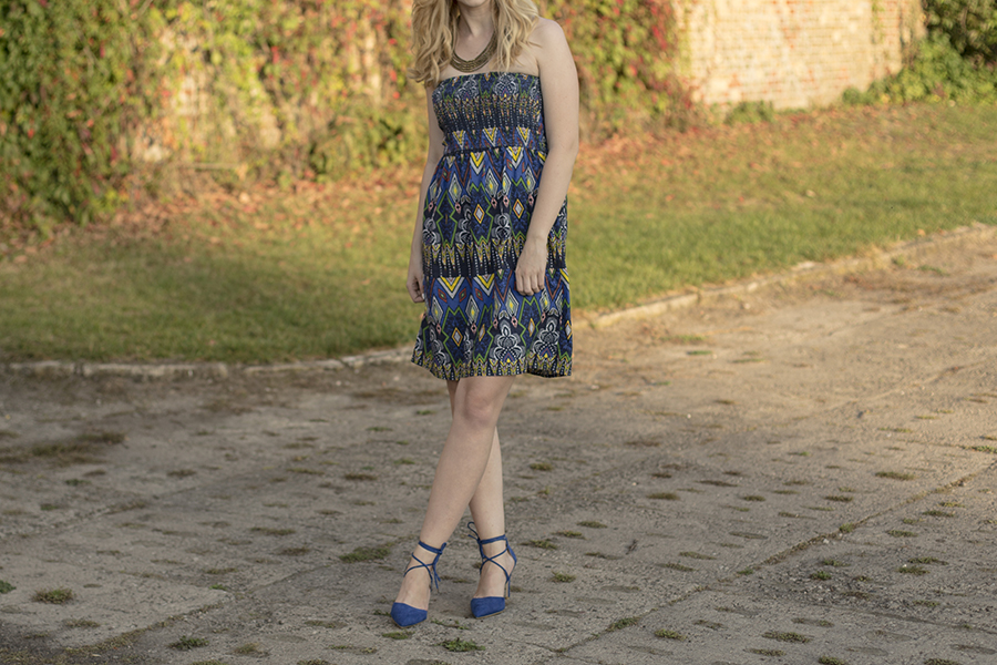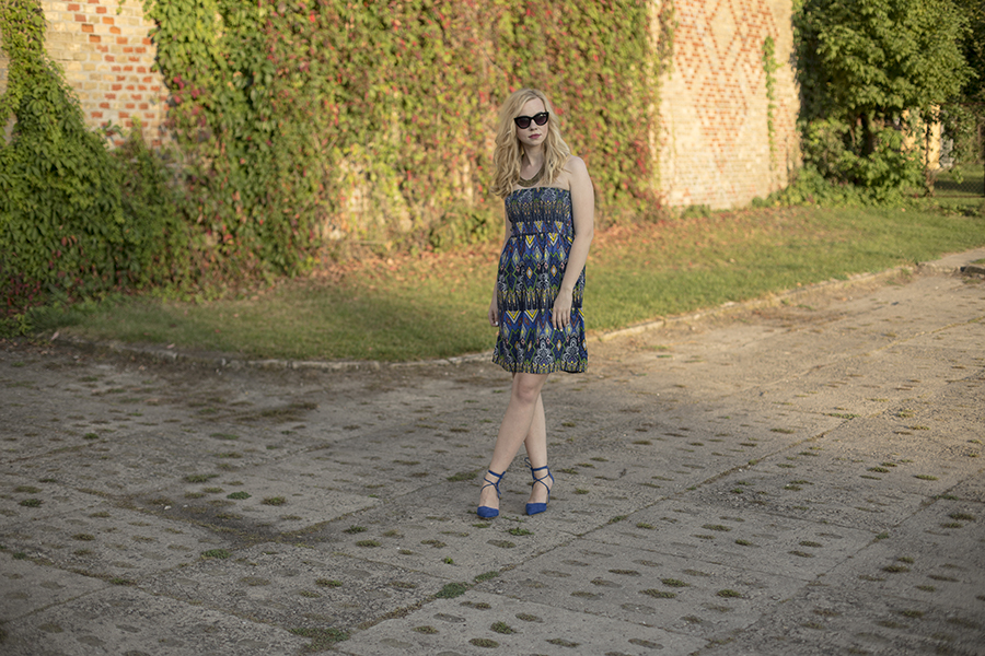 Czasami jedna sukienka wyraża więcej, niż tysiąc słów, a dokładniej jej wzór, którym do nas "krzyczy". Tak właśnie jest z tą "kreacją". Ma ona bardzo wyrazisty orientalny print i nie potrzebuje zbyt wielu dodatków, dlatego połączyłam ją tylko z granatowymi wiązanymi szpilkami, które całe lato czekały na swoją premierę i naszyjnikiem, który wisiał tyle czasu zapomniany, że nawet nie jestem w stanie powiedzieć gdzie i kiedy go kupiłam.