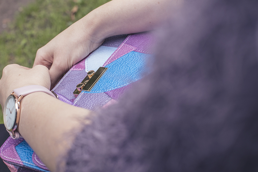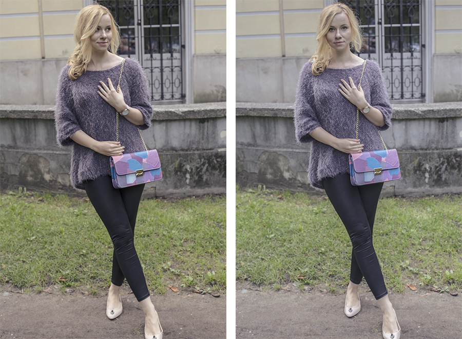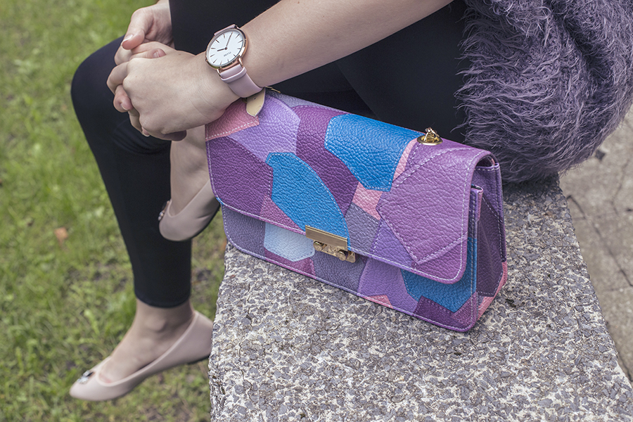Już wcześniej rozglądałam się za czymś w tym stylu. Marzyła mi się kolorowa torebka, która będzie pasować do wielu rzeczy i ożywiać nawet nudne codzienne stroje. Miałam nawet na oku jedną z Reserved, ale nie zdążyłam, na wyprzedaży rozeszła się jak świeże bułeczki. Po jakimś czasie trafiłam na tę, z nadrukiem w fioletowe, różowe i niebieskie łatki. Na stronie znajdziecie też kilka innych opcji kolorystycznych. Nie ukrywam, że one też bardzo mnie kusiły i utrudniały wybór. Ostatecznie jednak jestem bardzo zadowolona z decyzji, którą podjęłam. Torebka idealnie wpisała się w jesienny klimat i uważam, że pięknie współgra z moim ciepłym włochatym swetrem z second handu. A co wy o tym myślicie?