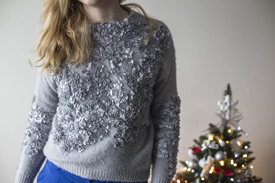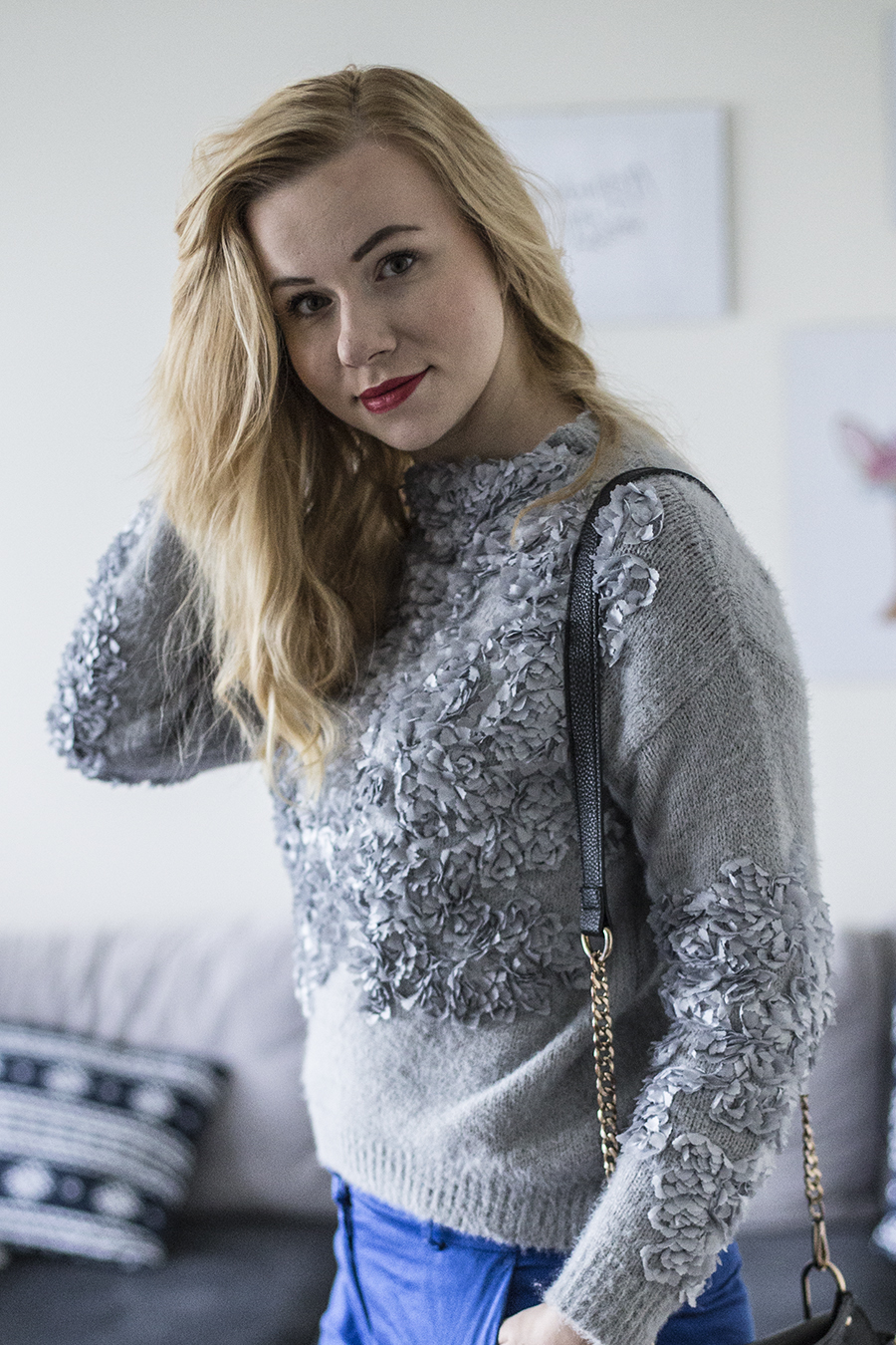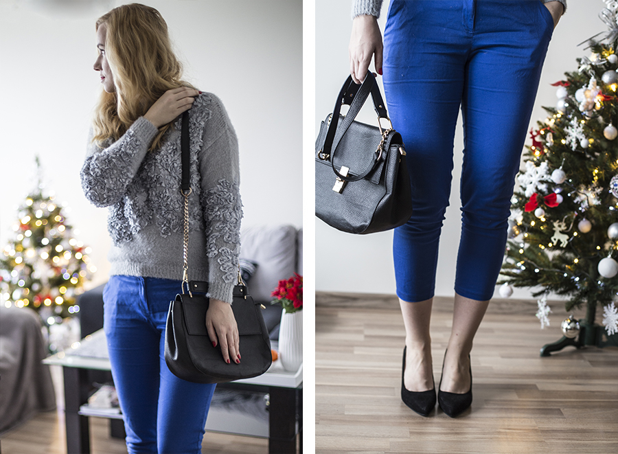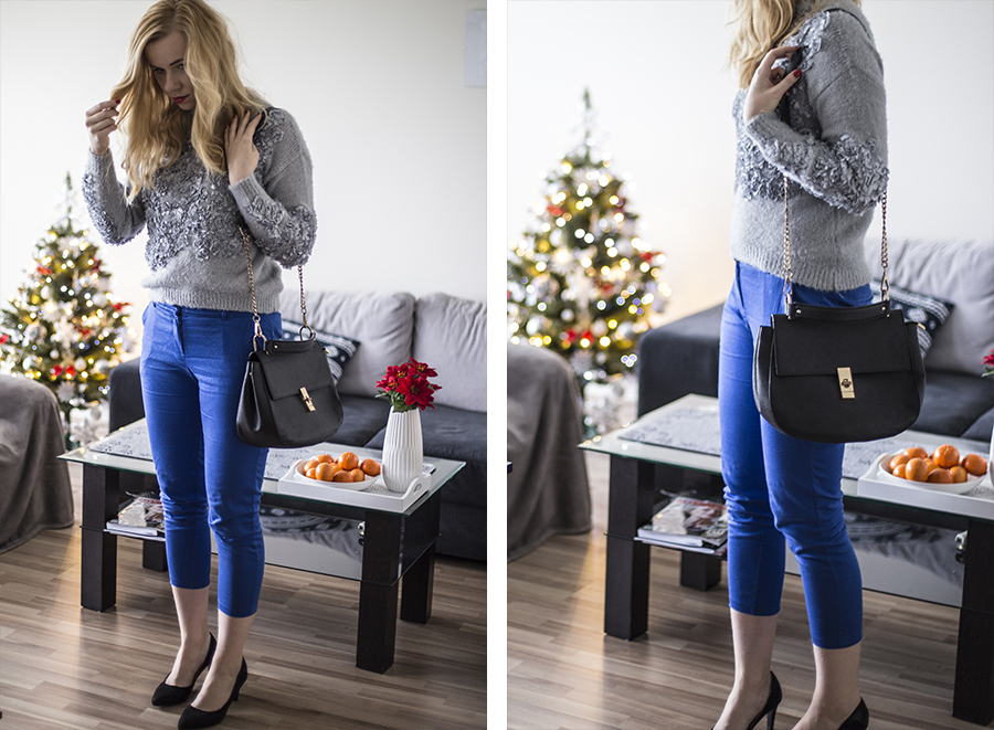 Dzisiejszą stylizację oparłam na  mocno zdobionym swetrze, w stonowanym, szarym kolorze i intensywnie niebieskich spodniach. Święta to czas kiedy możemy pozwolić sobie na odrobinę szaleństwa w stroju, a przy tym utrzymać wszystko w eleganckim tonie. Elegancja to nie tylko klasyczna biała koszula i ciemna spódnica. Czasem, aby utrzymać wszystko w ryzach, wystarczą klasyczne dodatki np. czarne szpilki. Uważam, że podczas mniej formalnych świątecznych spotkań warto pozwolić sobie na szyk w innym wydaniu niż oklepana klasyka. A co Wy myślicie?
